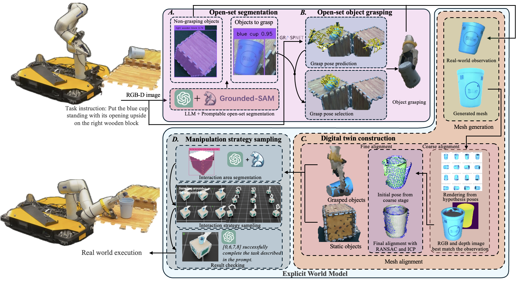 To this end, we propose a novel framework that builds an explicit world model for open-world object manipulation. The framework integrates open-set segmentation and grasping, 3D digital twin reconstruction, and simulation-based strategy sampling within a unified framework. At the core of our approach lies the construction of a physically grounded digital twin of the environment, which enables the framework to simulate and evaluate diverse interaction strategies before real-world execution. Experimentally, the proposed framework is able to perform multiple open-set manipulation tasks, such as “put the banana into the basket”, “stack the green cube onto the yellow cube”, and “place the blue cup upside on the wooden box”. These results are obtained without any task-specific action demonstrations, demonstrating strong generalization and autonomy compared to existing closed-set or imitation-based systems.